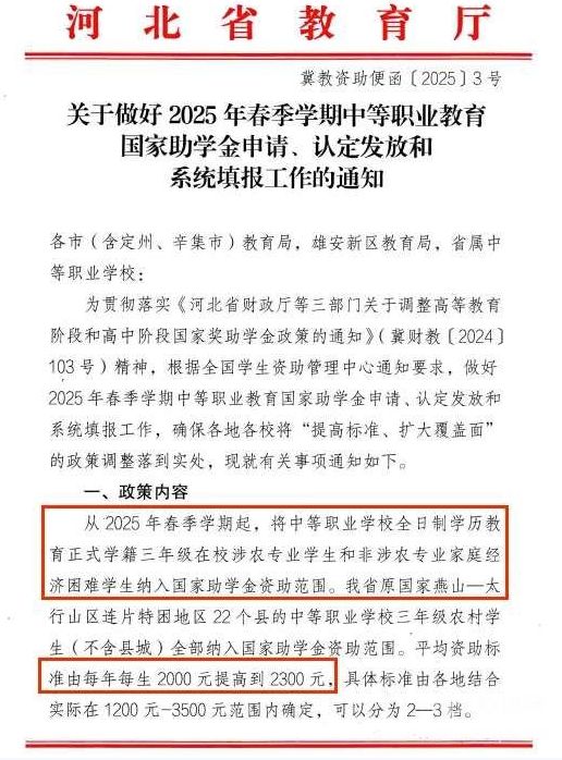 河北省教育厅有关助学金上调文件