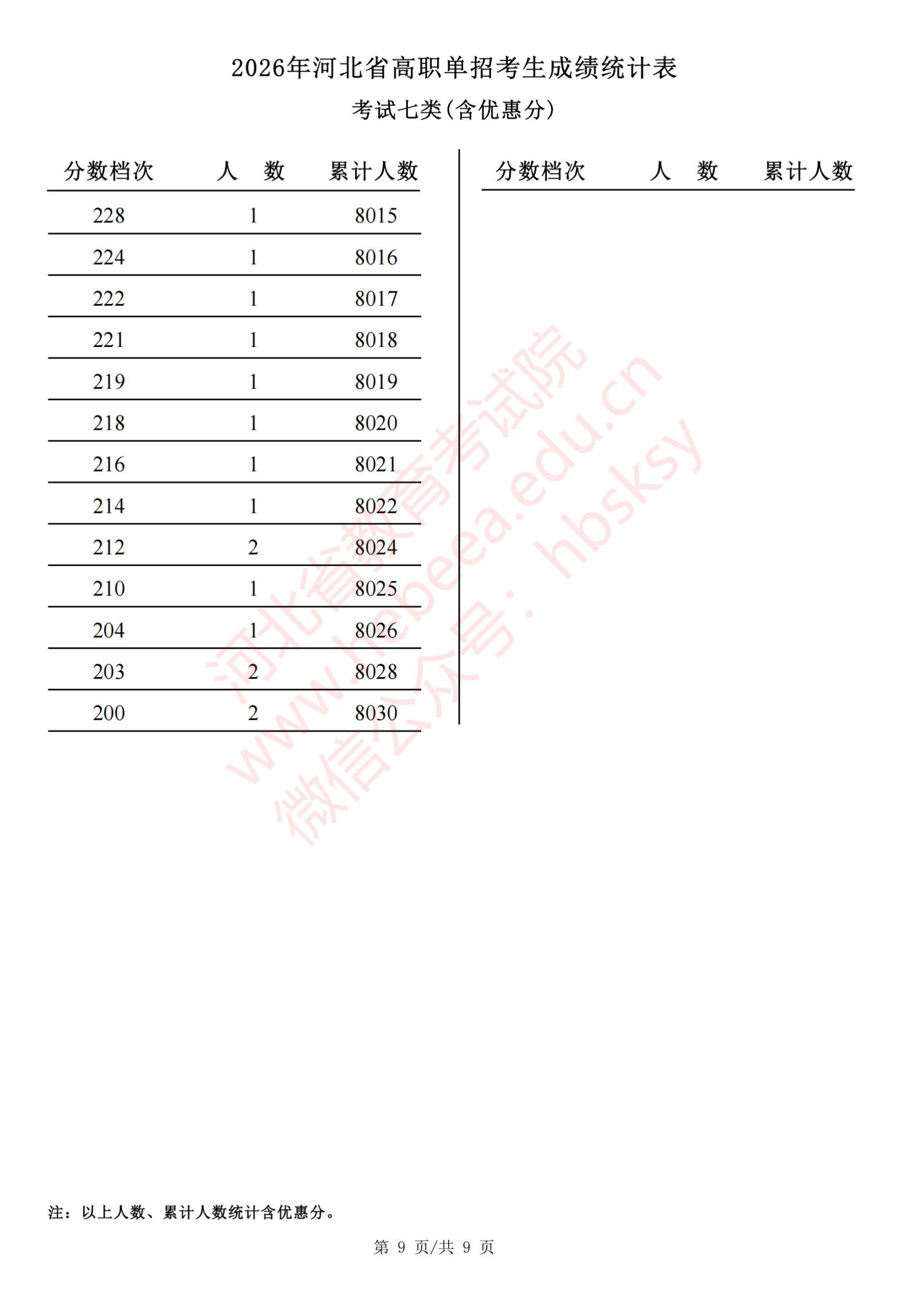 2026年河北省高职单招考生成绩统计表考试七类(含优惠分)一分一档表